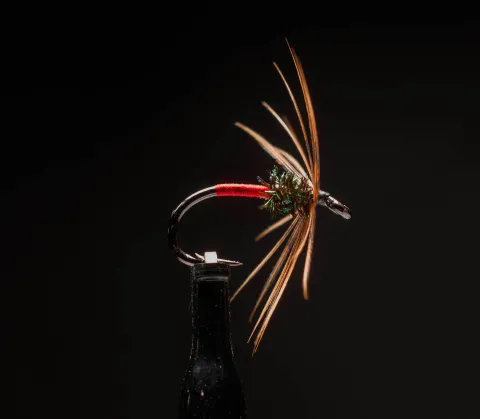 5. Tie in the herl and wrap to form a small thorax, just leaving space for the hackle.